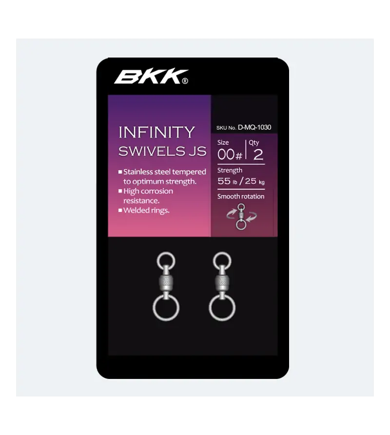 Το BKK Infinity Swivel JS είναι μια αναβαθμισμένη έκδοση του Infinity Swivel, σχεδιασμένο για αρματωσιές και σύλληψη μεγάλων αρπακτικών. Κατασκευασμένο από ανθεκτικό στη διάβρωση ανοξείδωτο ατσάλι, αυτό το περιστρεφόμενο ρουλεμάν που αποτρέπει το στρίψιμο της γραμμής κατά την προσγείωση των ψαριών και την ανάκτηση του δελεασμού. Διαπρέπει στην αναζήτηση δειγμάτων τροπαίων, καθιστώντας το ιδανικό για θαλάσσιο ψάρεμα. Ο μεγαλύτερος δακτύλιος σε αυτό το περιστρεφόμενο στήριγμα παρέχει επιπλέον ελευθερία κίνησης τόσο για τα βοηθητικά άγκιστρα όσο και για το jig κατά τη διάρκεια των παρουσιάσεων jigging, οδηγώντας σε βελτιωμένο ρυθμό σύνδεσης. Αυτό το αναβαθμισμένο απόθεμα αντοχής και η ομαλή περιστροφή του περιστρεφόμενου μειώνουν την πίεση στη γραμμή και τους κόμπους.