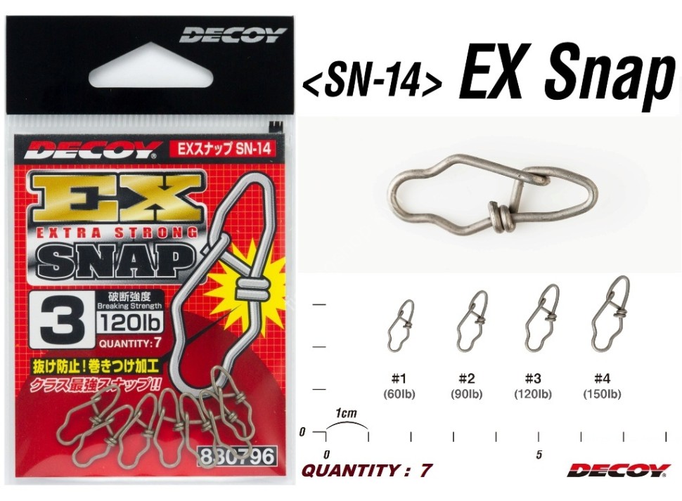 Η συγκεκριμένη παραμάνα είναι σημαντικό κομμάτι σε κάθε ψαρευτική συλλογή. Κάνει εύκολο και γρήγορο το ξεκούμπωμα των τεχνιτών και τούς δίνει πολύ καλύτερη κίνηση στο νερό. Η decoy ex snap είναι σταθερή και αρκετά δυνατή για κάθε είδους τεχνητού και δουλεύει πολύ καλά με jerkbaits,poppers και jig heads.Είναι κατάλληλη για ψάρεμα από ακτή και από βάρκα,σε ρηχά και βαθιά νερά.Αυτές οι παραμάνες έχουν αντιδιαβρωτική επίστρωση ,έτσι ένα πακέτο μπορεί να κρατήσει αρκετό καιρό εφόσον ξεπλένονται μετά την χρήση τούς. Ο λόγος πού μπορεί να σηκώσει περισσότερο βάρος είναι το σχήμα της και το κούμπωμα κλειδώματος πού χρησιμοποιείται σε αντίθεση με άλλα στυλ παραμάνας.Με το συγκεκριμένο κούμπωμα η σύνδεση που επιτυγχάνεται είναι πολύ πιο δυνατή από ότι με τις παραμάνες πού έχουν ευρύτερα κουμπώματα.